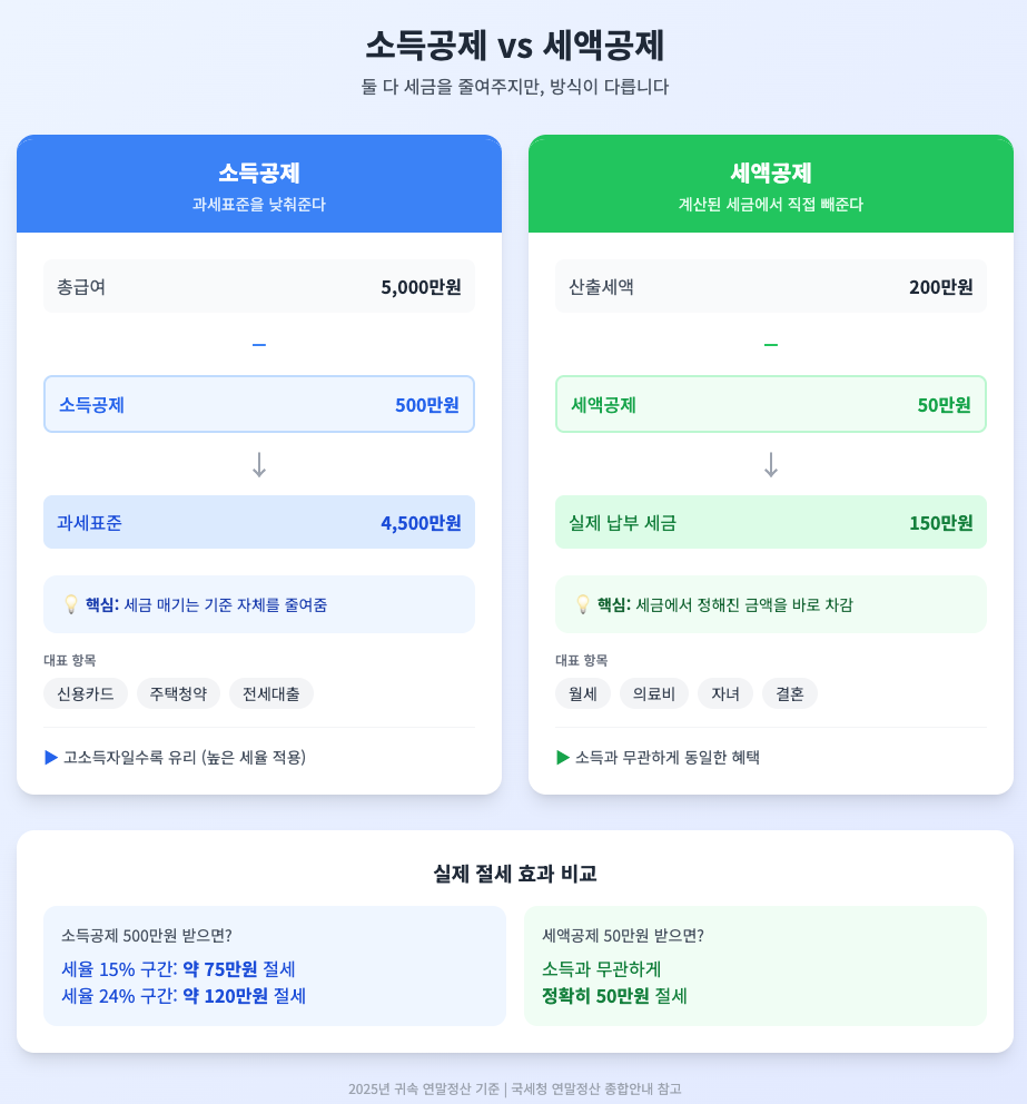 연말정산에서 가장 헷갈리는 개념이 이 둘의 차이입니다. 결론부터 말하면, 둘 다 세금을 줄여주지만 방식이 다릅니다.