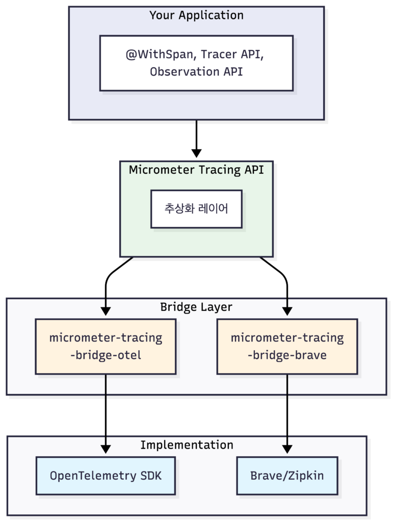 opentelemetry-spring-boot-starter: OpenTelemetry 프로젝트에서 제공. OTel API를 직접 사용micrometer-tracing-bridge-otel: Micrometer API를 사용하고, 내부적으로 OTel SDK로 변환둘 다 결국 OpenTelemetry 프로토콜(OTLP)로 데이터를 내보냅니다. 차이는 애플리케이션 코드에서 어떤 API를 사용하느냐입니다. 다만 OpenTelemetry 문서에서 언급한 기본 방식은 Java Agent입니다. 그리고 현재 지원하는 instrumentation 종류가 Micrometer 구현체 쪽이 더 많습니다(ex: reactive mongo client, redis client 등). 그래서 Spring 애플리케이션에서 Tracing을 라이브러리 방식으로 한다면 Micrometer 구현체가 좀더 적합하다고 생각합니다.