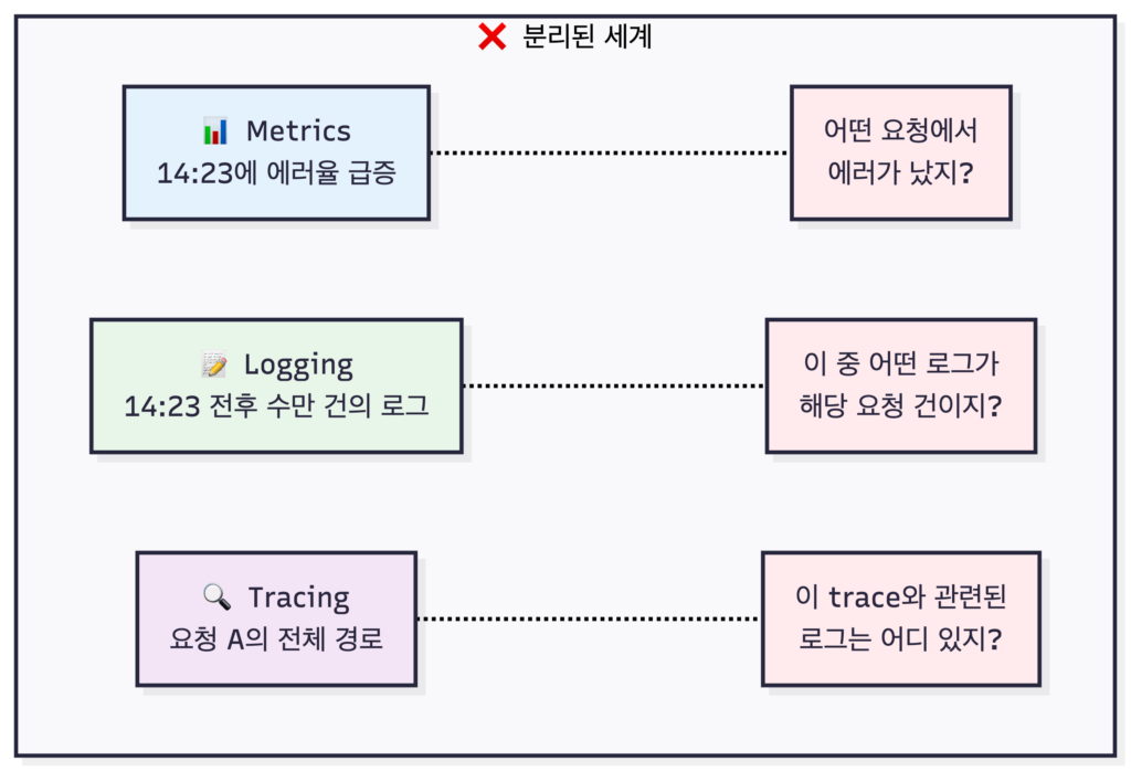 대시보드에서 갑자기 에러율이 치솟는 걸 발견했다고 가정해봅시다. Metrics가 알려주는 건 “에러가 많이 발생하고 있다”는 사실뿐입니다. 어떤 요청에서 에러가 났는지, 그 요청이 어떤 경로를 거쳤는지는 알 수 없습니다. 로그를 뒤져야 하는데, 에러가 발생한 시간대의 로그가 수만 건이라면? 그중에서 문제의 요청을 찾는 건 사막에서 바늘 찾기입니다.