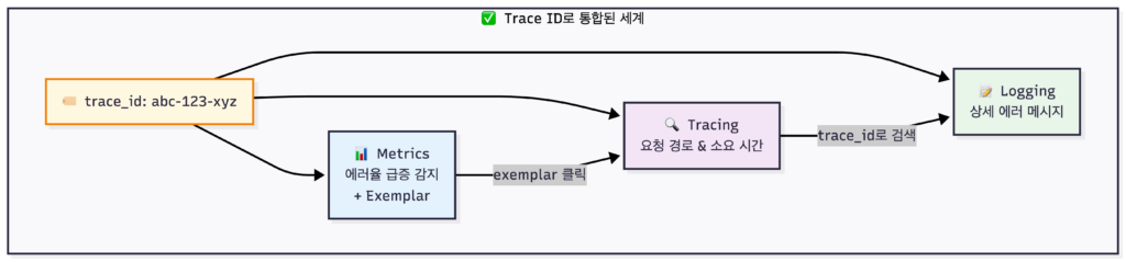 하나의 Trace ID로 세 가지 데이터를 연결하면, “대시보드에서 이상 징후 발견 → 문제 원인 파악”까지의 시간이 획기적으로 줄어듭니다.