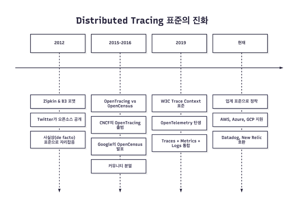 Distributed Tracing이 필요하다는 건 모두가 알았지만, 어떻게 구현할지는 제각각이었습니다.
